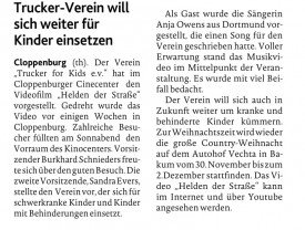 Trucker for Kids organisieren LichterkonvoiCloppenburg (her). Nach dem coronabedingten Ausfall ihres Lichterglanzes bieten die „Trucker for Kids" aus Cloppenburg am Samstagnachmittag einen kleinen Konvoi durch die Kreisstadt an. Geplant ist unter anderem ein Stopp in der Beckermann-Kurve, dort wird Schirmherr…