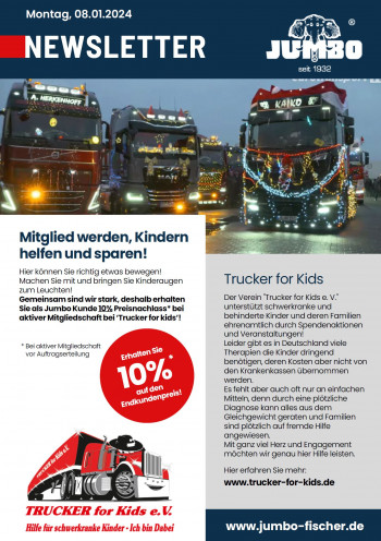 Eine gute Nachricht haben wir nun für alle, die bereits Mitglied bei Trucker for Kids sind. Und zwar bekommt ihr ab sofort bei Jumbo-Fischer 10 % Preisnachlass bei aktiver Mitgliedschaft bei uns unter Nennung eurer Mitglieds-Nr.