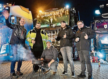 Am Sonntag, erklärt sie, nehme sie wieder den geparkten Trailer auf und setze die Tour fort. Viele Lkw-Fahrer hatten vor ihre Trucks kleine Feuertonnen aufgestellt oder gleich einen Grill. Wie beispielsweise Detlef Franzke aus Vechta. Er ist für Schockemöhle tätig. Die Spedition war mit zwei Trucks dabei.