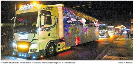 Auf einer 6 Kilometer langen Strecke sind am Samstagabend über 60 festlich beleuchtete Lkw hupend durch Bakum gerollt, um Tausende Zuschauer zu begeistern. „Allein an der Harmer Straße standen rund 15.000 Menschen“, sagt Burkard Schnieders.