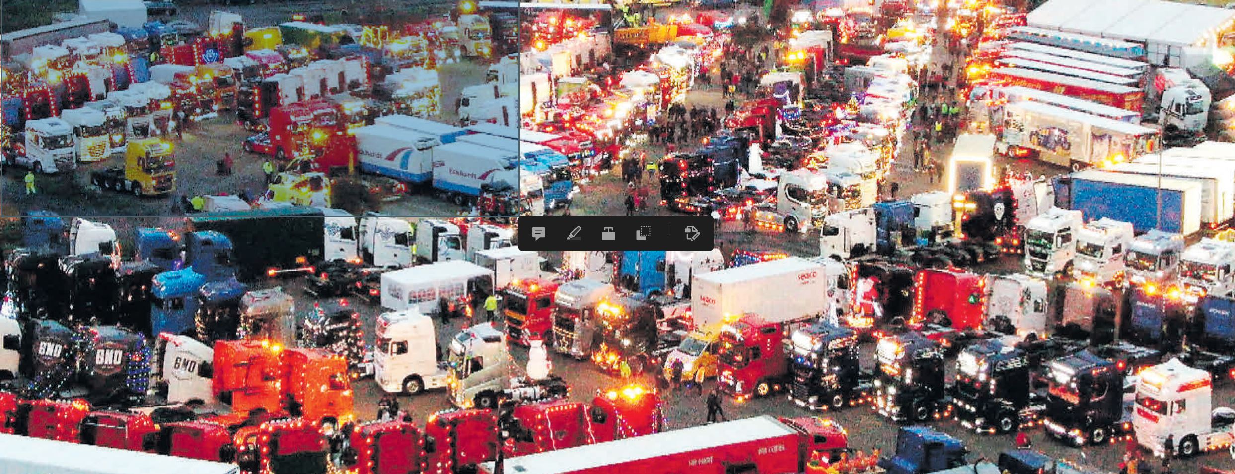 Beeindruckendes Bild: Rund 380 weihnachtlich beleuchtete und geschmückte Lastwagen sind amSamstag unter dem Motto „Lichterglanz“auf dem Autohof in Harme in Bakum zusammengekommen.